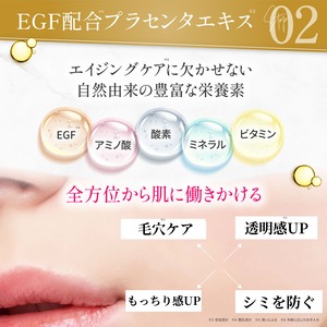 プラセンタエキス、水、ダマスクバラ花水、グリセリン、BG、ペンチレングリコール、アスコルビルメチルカルボニルペンタペプチド-72-トリ-t-ブチルトリプトファナミド、ポリ-ε-リシン、ポリソルベート20、クエン酸、クエン酸Na